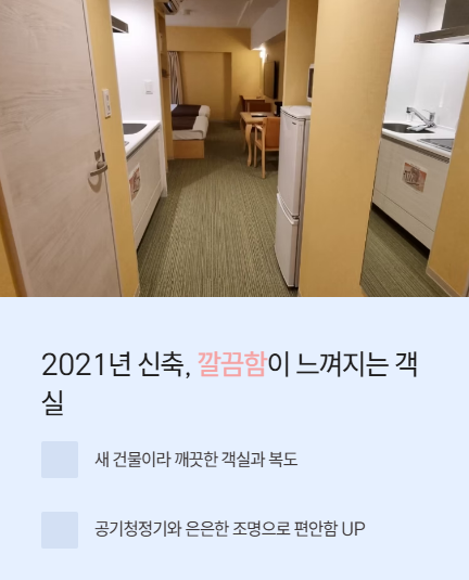 → 신축 호텔이라 깨끗하고 아파트형 구조라 넓습니다.