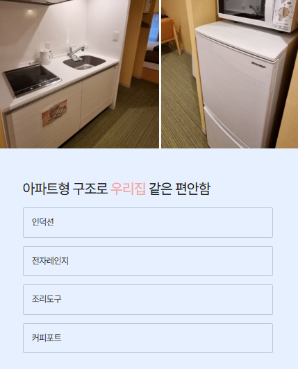 실제로 방 안에 인덕션, 전자레인지, 커피포트, 간단한 조리도구까지 다 갖춰져 있었어요.