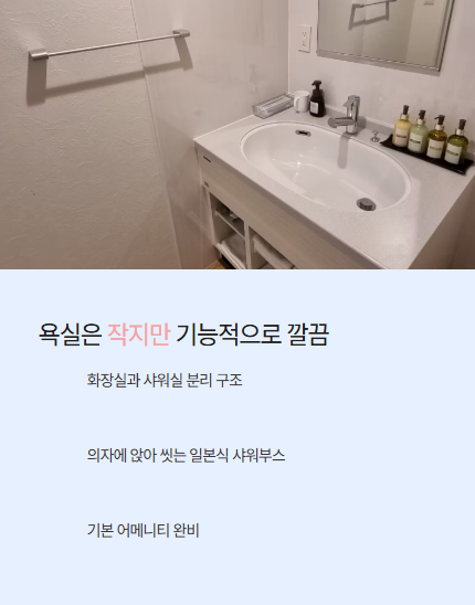 화장실과 샤워실이 분리돼 있고 욕조는 없었지만, 의자에 앉아 씻을 수 있는 일본식 샤워 부스라 생각보다 편했습니다.