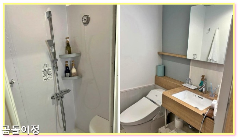욕실은 아담하지만 정말 깨끗했고, 어메니티는 로비에서 필요한 만큼 가져가는 시스템이라 합리적이었습니다.