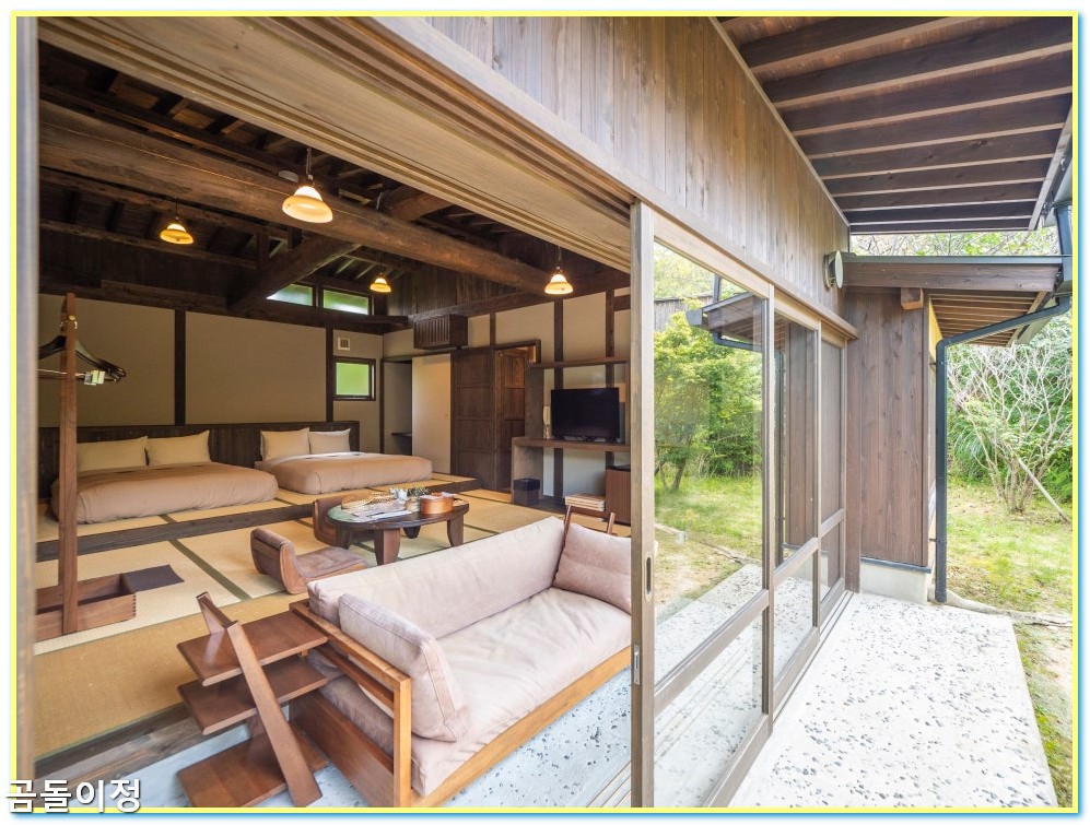 객실 안에는 전용 개인탕이 있고, 창문을 열면 자연의 향이 스며듭니다.